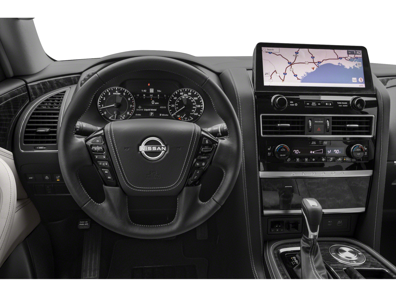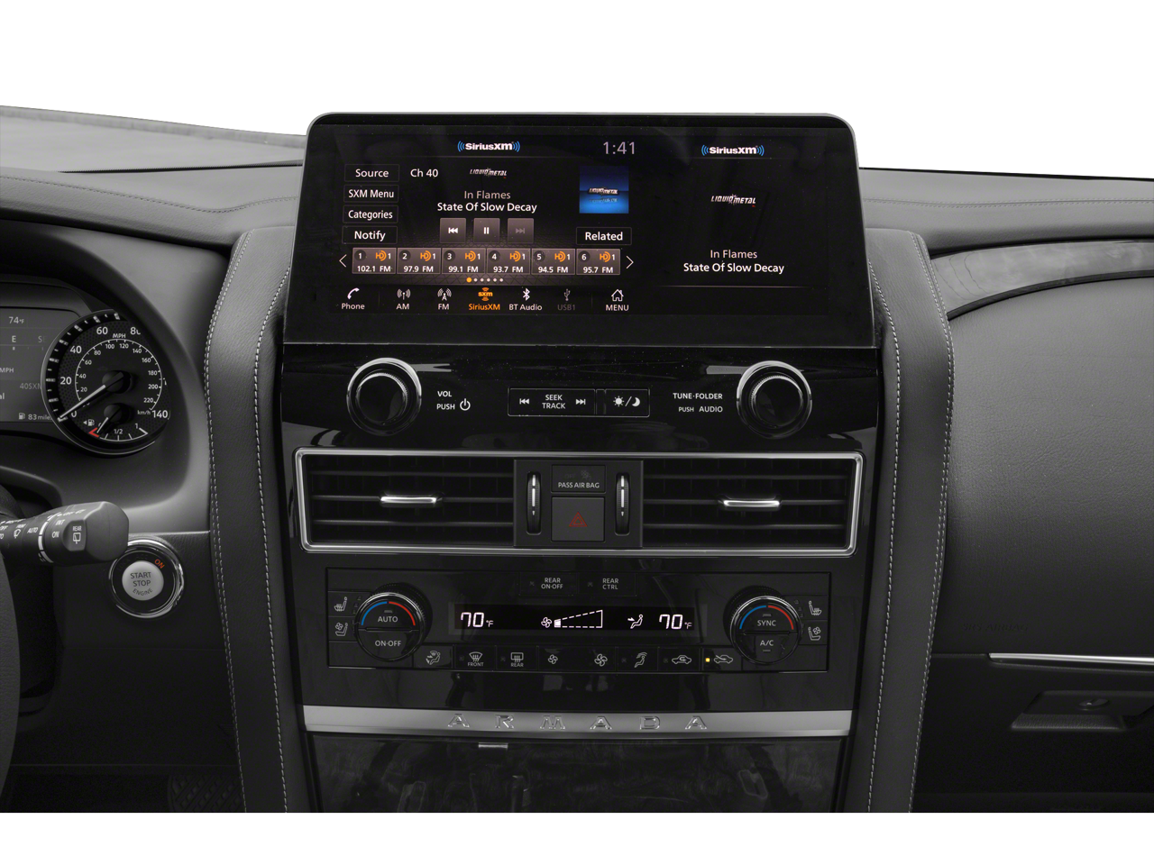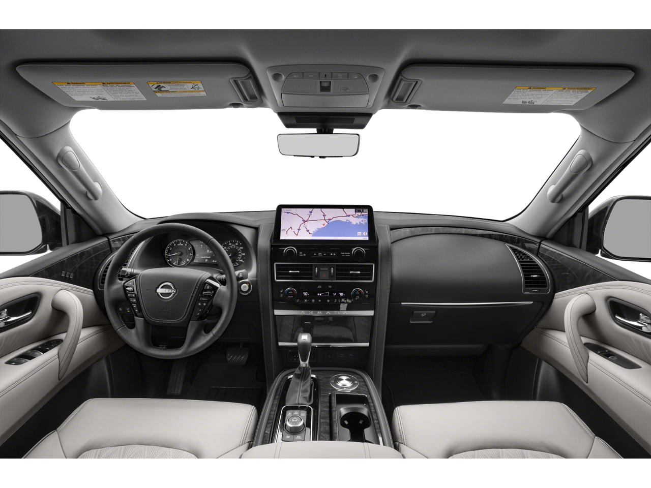 * Bluetooth®/Handsfree Calling *, * USB Adapter *, 13 Speakers, 2.937 Axle Ratio, 3rd Row Carpeted Floor Mats - Bench Seat, 3rd row seats: split-bench, 4-Wheel Disc Brakes, ABS brakes, Air Conditioning, Alloy wheels, AM/FM radio: SiriusXM, Anti-whiplash front head restraints, Auto High-beam Headlights, Auto tilt-away steering wheel, Auto-dimming door mirrors, Auto-dimming Rear-View mirror, Auto-leveling suspension, Automatic temperature control, Brake assist, Bumpers: body-color, Cargo Package, Climate-Controlled Front Bucket Seats, Delay-off headlights, Driver door bin, Driver vanity mirror, Dual front impact airbags, Dual front side impact airbags, Electronic Stability Control, Emergency communication system: NissanConnect Services, Exterior Parking Camera Rear, Four wheel independent suspension, Front anti-roll bar, Front Bucket Seats, Front Center Armrest, Front dual zone A/C, Front fog lights, Front reading lights, Fully automatic headlights, Garage door transmitter: HomeLink, Heated door mirrors, Heated front seats, Heated rear seats, Heated steering wheel, HVAC memory, Illuminated entry, Illuminated Kick Plates, Illuminated Scuff Plate, Knee airbag, Leather Shift Knob, Leather steering wheel, Low tire pressure warning, Memory seat, Navigation System, Nissan USB Charging Cable Set, Occupant sensing airbag, Outside temperature display, Overhead airbag, Overhead console, Panic alarm, Passenger door bin, Passenger vanity mirror, Power door mirrors, Power driver seat, Power Liftgate, Power moonroof, Power passenger seat, Power steering, Power windows, Quilted Leather Seat Trim, Radio: NissanConnect w/SiriusXM, Rain sensing wipers, Rear air conditioning, Rear anti-roll bar, Rear reading lights, Rear seat center armrest, Rear window defroster, Rear window wiper, Reclining 3rd row seat, Remote keyless entry, Roof Rail Cross Bars - Gun Metal, Security system, Speed control, Speed-sensing steering, Speed-Sensitive Wipers, Split folding rear seat, Spoiler, Steering wheel memory, Steering wheel mounted audio controls, Tachometer, Telescoping steering wheel, Tilt steering wheel, Traction control, Trip computer, Turn signal indicator mirrors, Variably intermittent wipers, Ventilated front seats, Voltmeter, Wheels: 22 x 8J Machine-Faced w/Tinted Clear Coat.